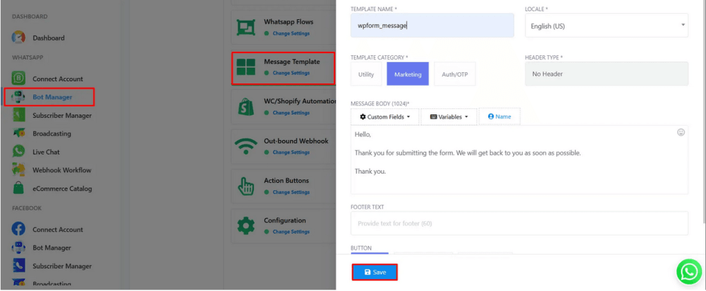 - From the BotGenius dashboard, go to WhatsAppBot Managerand selectMessage Template.