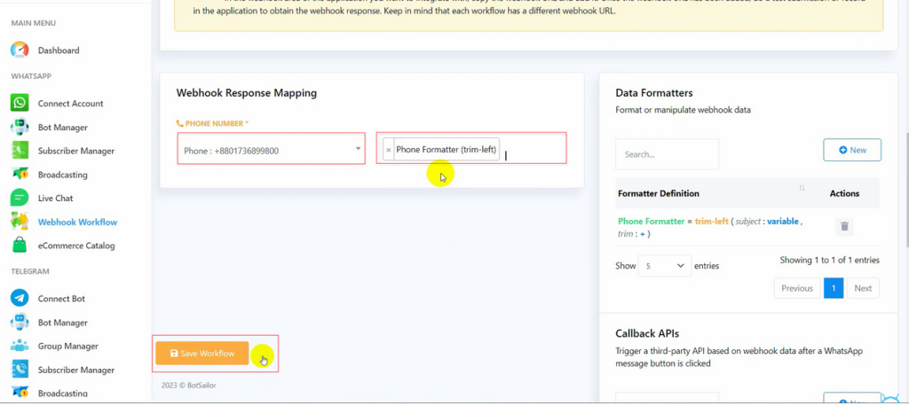 - Now, from theWebhook response mapping; click on thephone number fieldand select the phone number from the raw data.