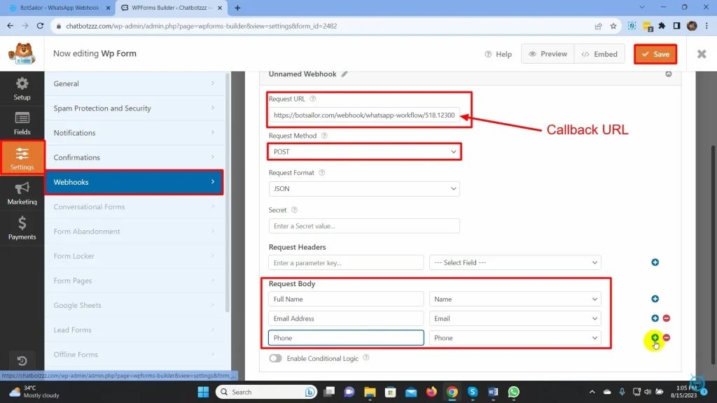 - Now, go toWP form settings, select thewebhook,andenable the Webhooks.
