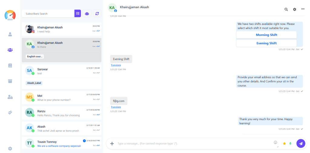 Using BotGenius’s Omnichannel Inbox is simple. Begin by integrating your WhatsApp, Facebook, Instagram, Telegram, and Webchat accounts. Then, access the Shared Inbox to instantly see all your customer inquiries across those platforms, organized in a clear, sequential view like this: