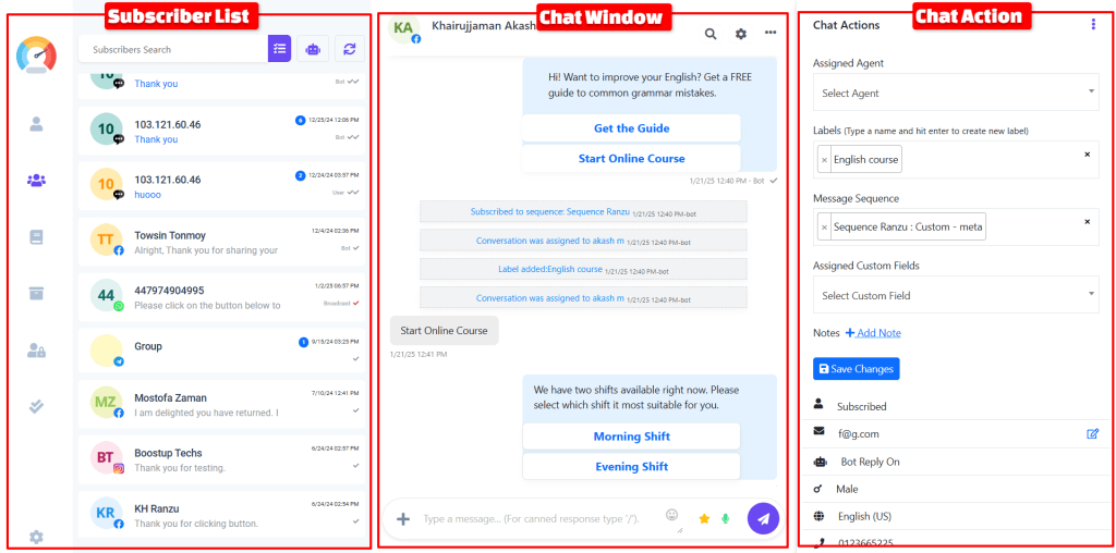 - The BotGenius Omnichannel’s Subscriber List section centralizes all your subscribers acquired through WhatsApp, Facebook, Instagram, Telegram and also website integration or webchat, allowing for efficient management and communication.