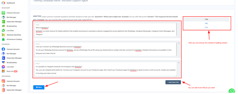 - FAQs: Manually enter frequently asked questions and their answers to guide the AI responses.
