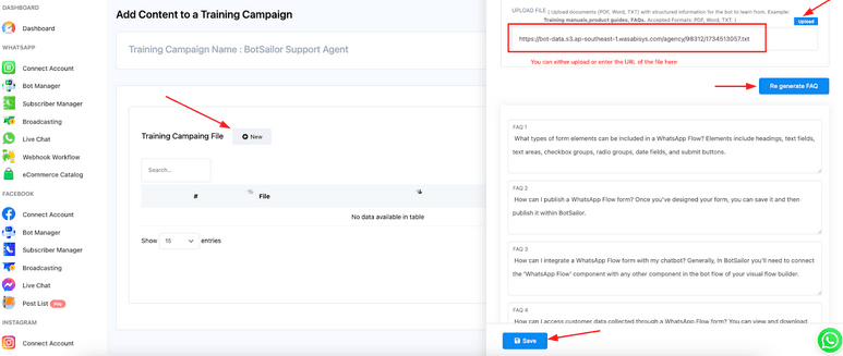 - Access the AI Training Section: In your BotGenius dashboard go to ‘Settings’ and select’ AI Training Campaign’.