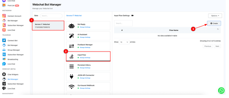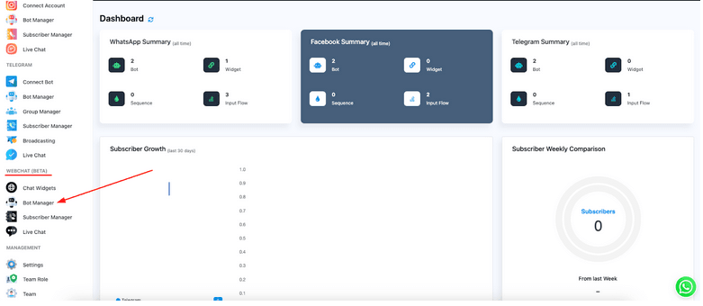 - First, you have to go to the BotGenius dashboard and navigate to “Bot Manager” under the webchat section.