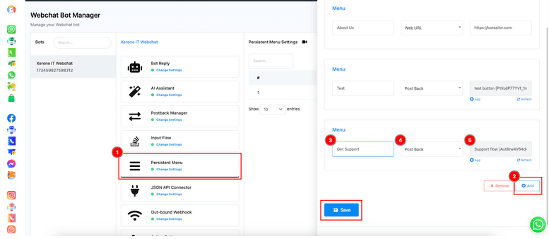 - Let’s make it more accessible by adding this flow to the persistent menu. Go to Persistent Menu, edit or create the menu, add a section, give it a name, set type as Post Back and select your flow you created. Then save it.