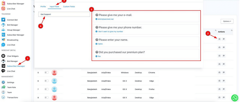 - After giving user input flow, the given information is saved in the “Subscriber Manager” of BotGenius. You can easily see them any time you like!