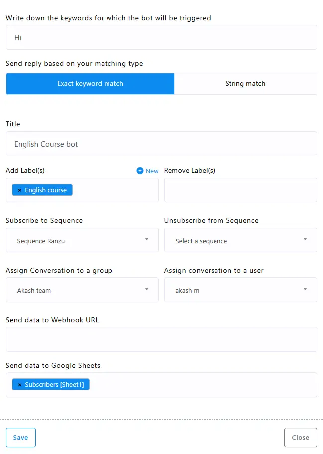 At First you will need to set Trigger Keywords such as hi, hello, hi there, etc that will activate your chatbot when encountered in user messages.
