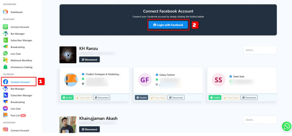 Go to the Connect Account option from the Facebook section. On the top of the screen you can see a button called Log In With Facebook. Click on it and your Facebook account will be connected with BotGenius. After connecting your Facebook account with BotGenius, you will be able to create messenger Chatbots.