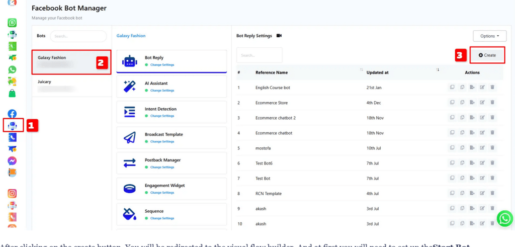 From the Bot Reply option, Click on the Create button to create a new bot flow.