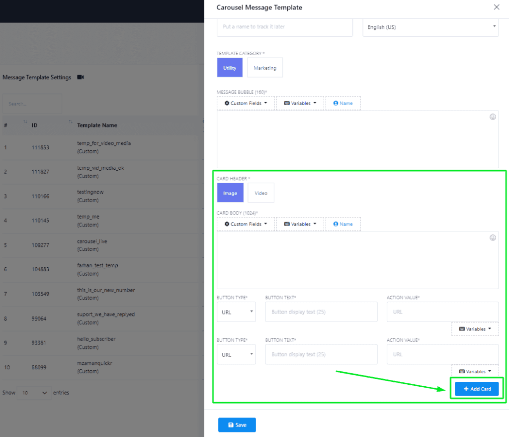 The rest of the steps, including adding cards, customising buttons, and saving the template, remain the same as for the image carousel template.