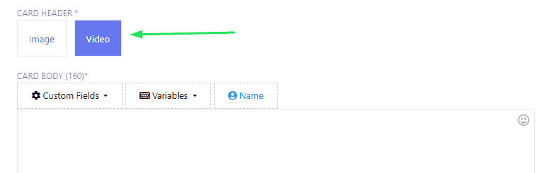 Sending Video with the carousel media templateis easy as well. All you have to do is change the ‘Card Header’, from Image to Video.