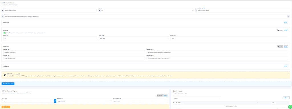 - ClickVerify Connectionto ensure the setup works. If successful, the response data will display.