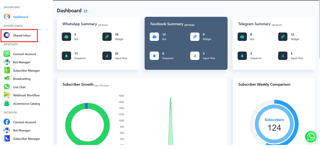 First log in to your BotGenius account. Then go to the dashboard and click on the Shared Inbox option.
