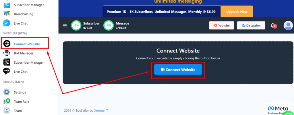 First of all, navigate to the Webchat’sConnect Websiteoption from BotBotGenius Sailor dashboard and click onConnect Websiteas you can see on the screenshot. It will take you to the webchat configuration menu.