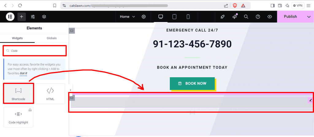 Search forCodefrom the left side in theWidgetssection. Select theShortcodewidget; drag and drop inside any container in the page.