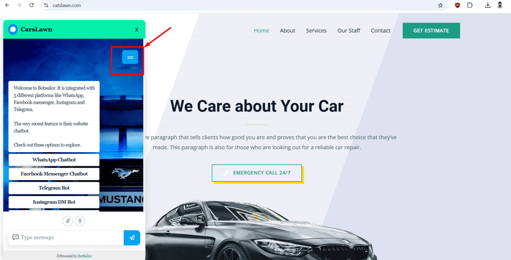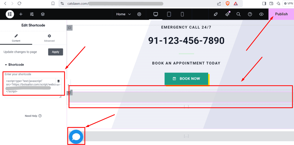 Now paste the embed code on theshort codesection from the left side. You can see the web chat box will appear. Publish the page to make it live.