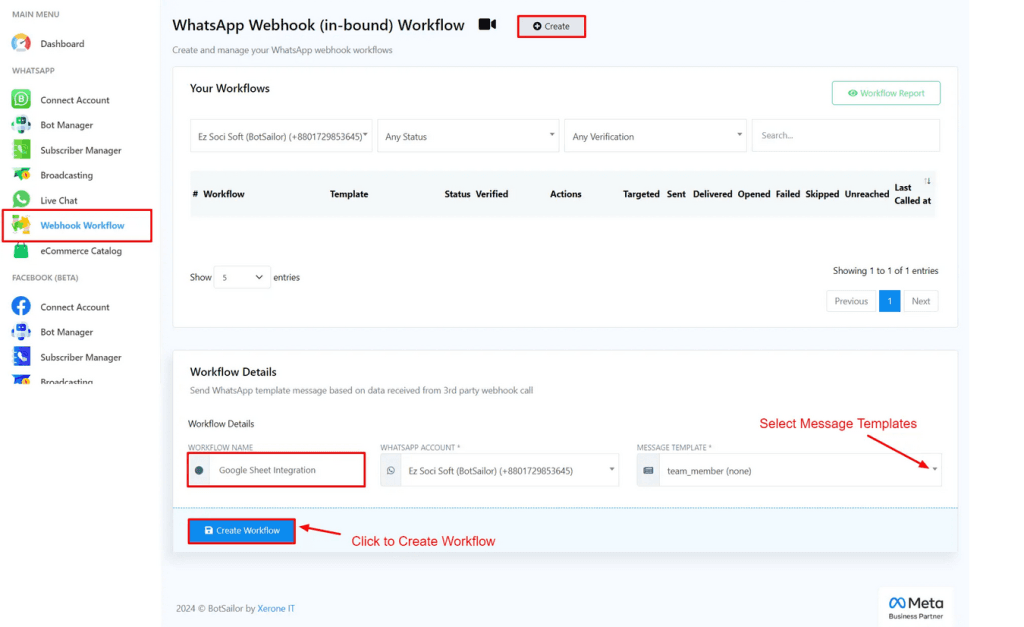 - From the left side menu click on theWebhook Workflowand then click on theCreatebutton.