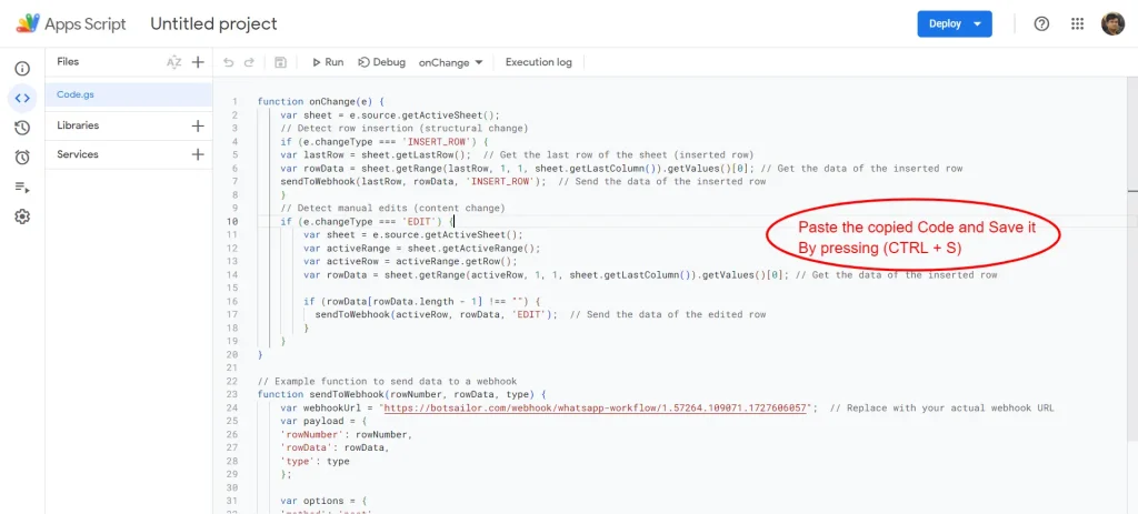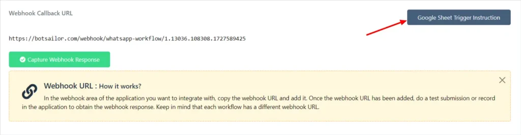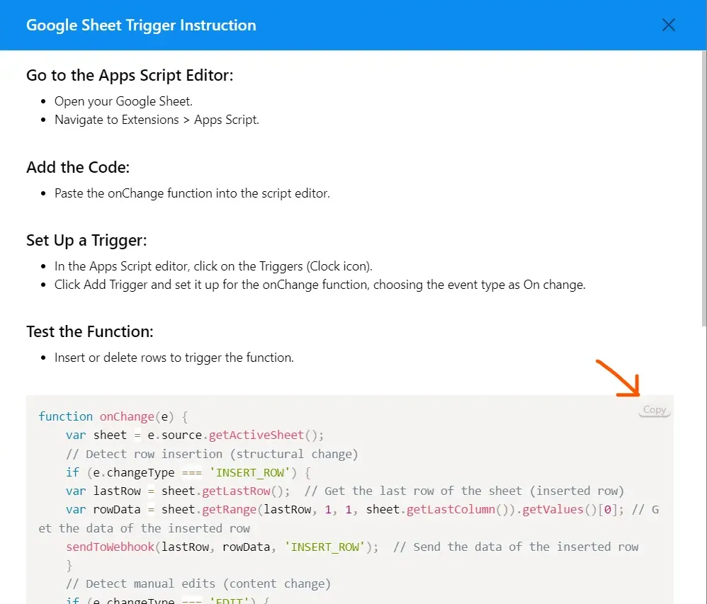 It will create a Webhook and provide a“Google Sheet trigger Instructions”button. Click on this button to get instructions. This will provide a clear instruction and ablock of code. Just copy that code and go to the Google Sheet.