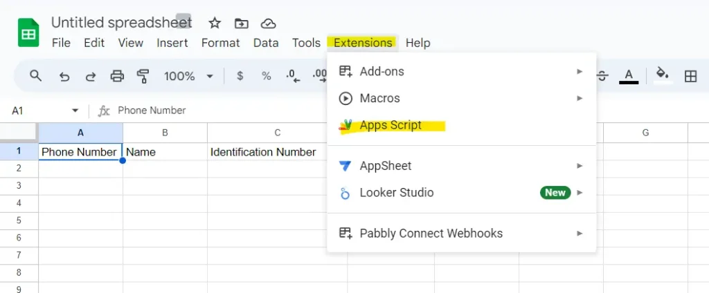 - From the Google Sheet’s top menu, go toExtensionsand click on theApp Script.Paste the code that we have copied from the BotGenius. (Replace the existing function).After pasting the code, we must save it by pressing the CTRL + S.
