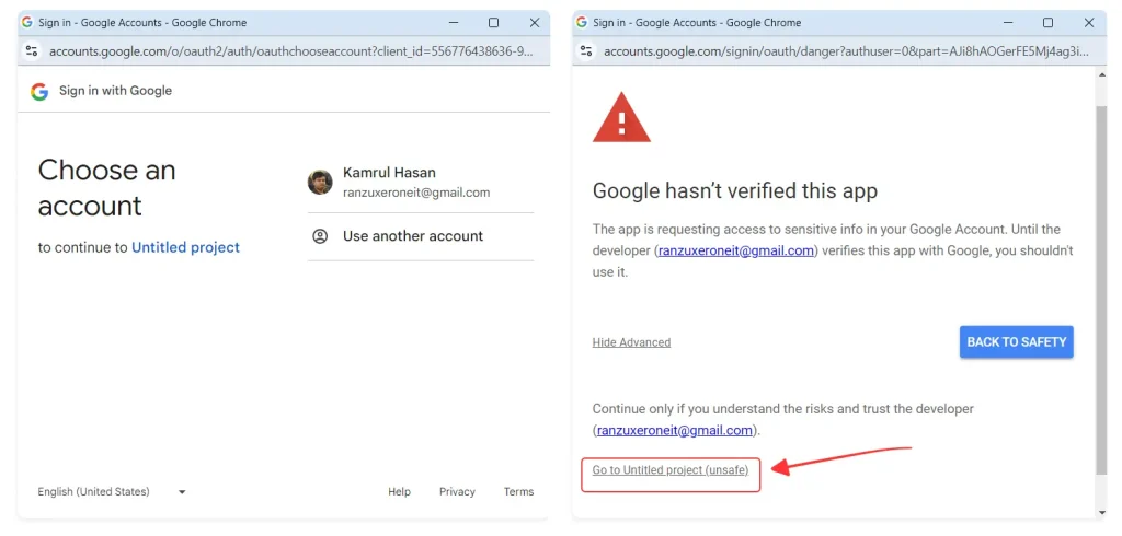 3. While saving, it may ask to select the google account and verify the app. Just select yourgoogle accountand then click on theAdvancedoption and then select“Go to project”. And then just click onAllowbutton.