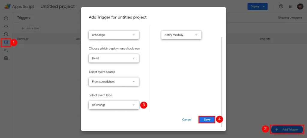 2. After saving the code, from the left side menu, click on the“Triggers”option and then click on“Add Trigger”.From there, select the event type as“On Change”and finally save it.