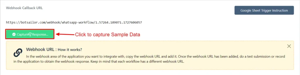 - Go back to the BotGenius and click on the“Capture Webhook Response”And then switch back to Google sheet and addsample data to the sheet. This data will be received on BotGenius as raw data, this data will help to Map the data to Message Template.