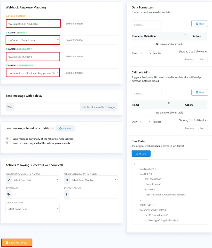 - On the phone number field, select the Phone number column data. In the same way, map the row data for the variables that were used in the message templates.