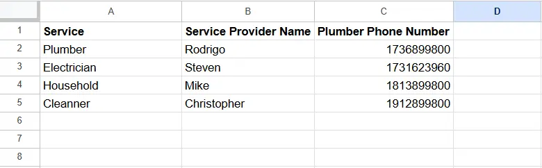 I will do this with an example sheet to help you better understand. I have a list of service providers for different kinds of services. If a customer is asking for a plumber, the bot will look at the Google Sheet to search for the word “plumber” and fetch the plumber’s name and contact numbers from that row to use in the bot replies.