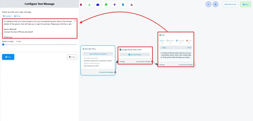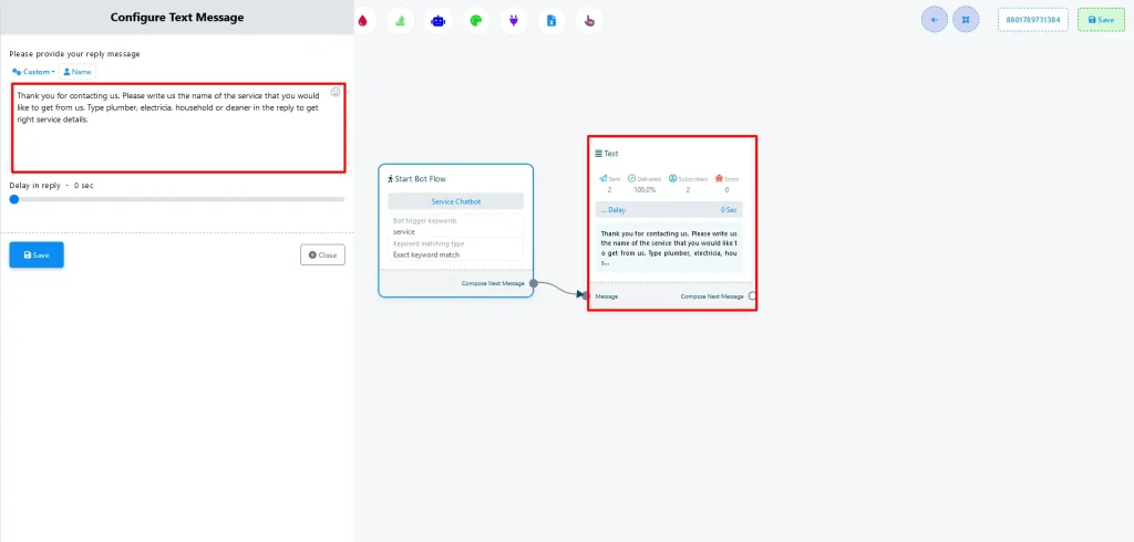 - Provide keywords and assign a name to the bot. Add a Text Reply to the bot, in the reply ask your subscribers to provide the service name that they are looking for from your available services. Ask users to mention the services they are looking for like, Plumber, electrician, household, cleaner.