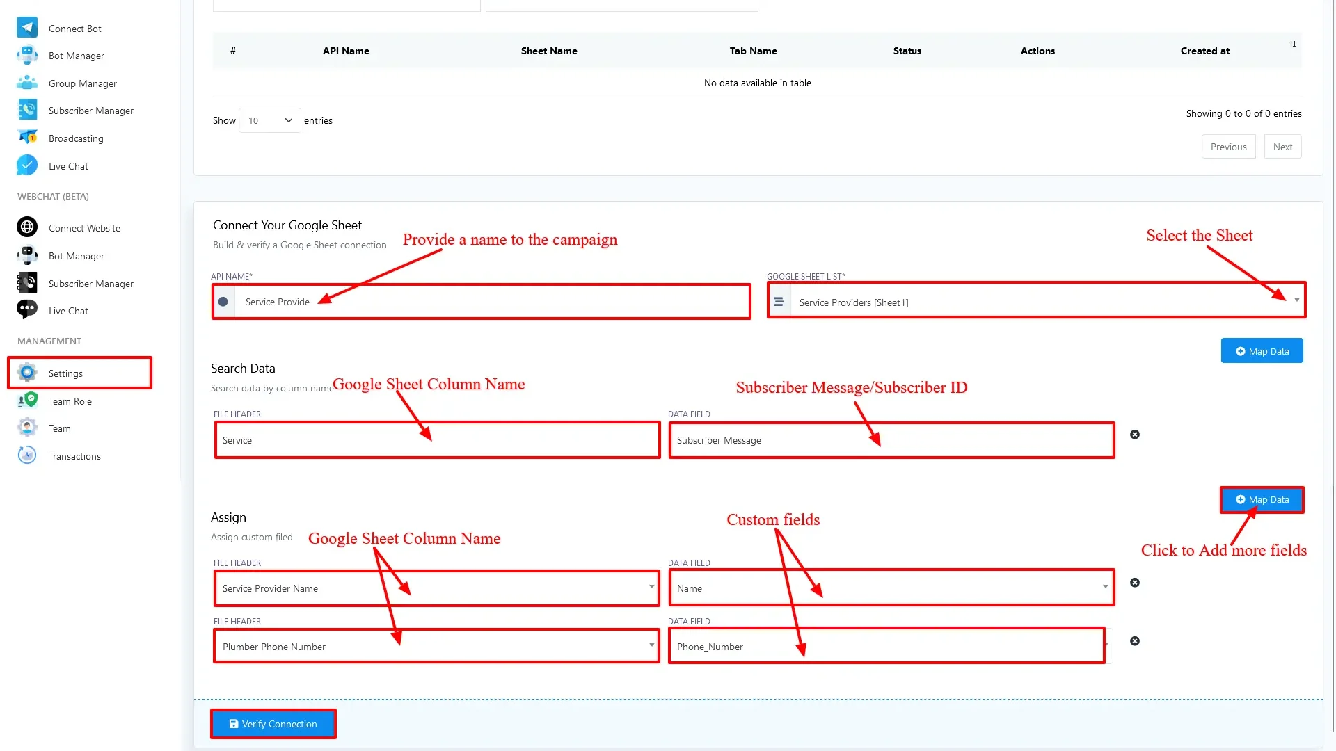 For example, if you run a business offering services like plumbing, electrical work, and other household solutions, you can seamlessly provide relevant contact information through your WhatsApp chatbot. When a customer inquires about a plumber, the chatbot can automatically collect relevant data like the contact person’s name and phone number, ensuring a smooth and efficient user experience. Google Sheet data fetch is available for WhatsApp, Facebook Messenger, Instagram DM, Telegram, and native Webchat. This means the feature is compatible with all messaging channels supported by BotGenius.
