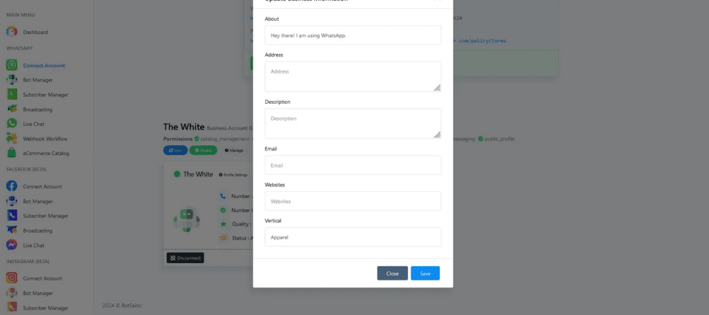 We are pleased to announce a new feature on BotGenius. This feature will allow you to change the profile settings of your WhatsApp Cloud API. On a personal WhatsApp account, you can normally set the status, add an address, and various information. Since the WhatsApp Cloud API cannot be accessed from the mobile app, we have implemented an option on BotGenius that will help you change the status and add various information, such as address, description, email, and website address.