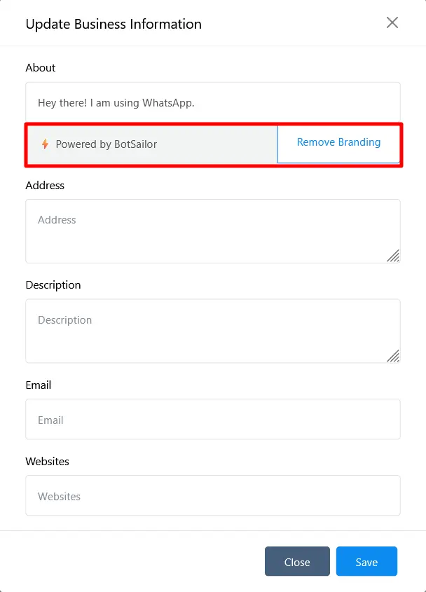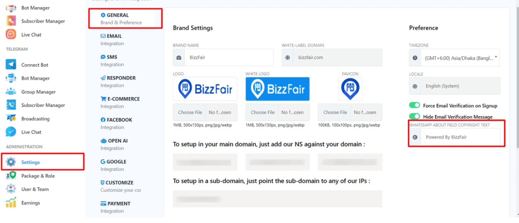 BotGenius White Label Reseller users can also use this branding option for their users. Let’s see how you can add your branding in the settings. Go to Settings from the BotGenius dashboard, then select General and enter the branding text in the field called “WHATSAPP ABOUT FIELD COPYRIGHT TEXT.”