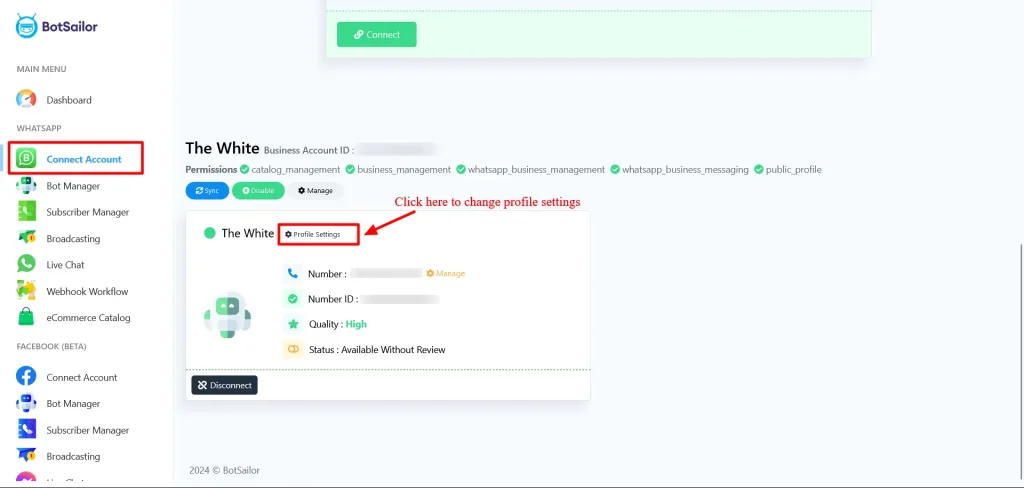 To add profile information, go to the WhatsApp Connect Account from BotGenius dashboard. As soon as you click on it, all the connected accounts will appear.