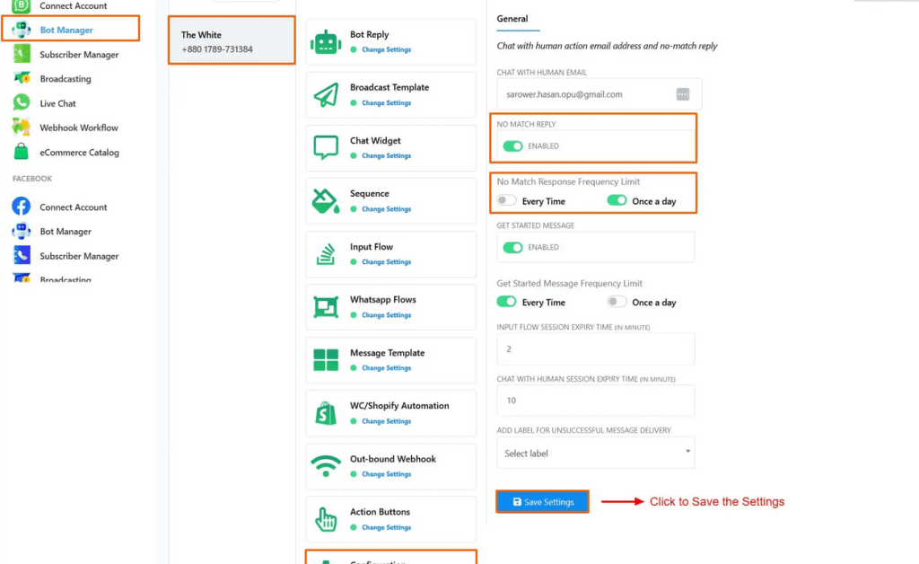 WhatsApp No Match Reply Bot and its Frequency Setup